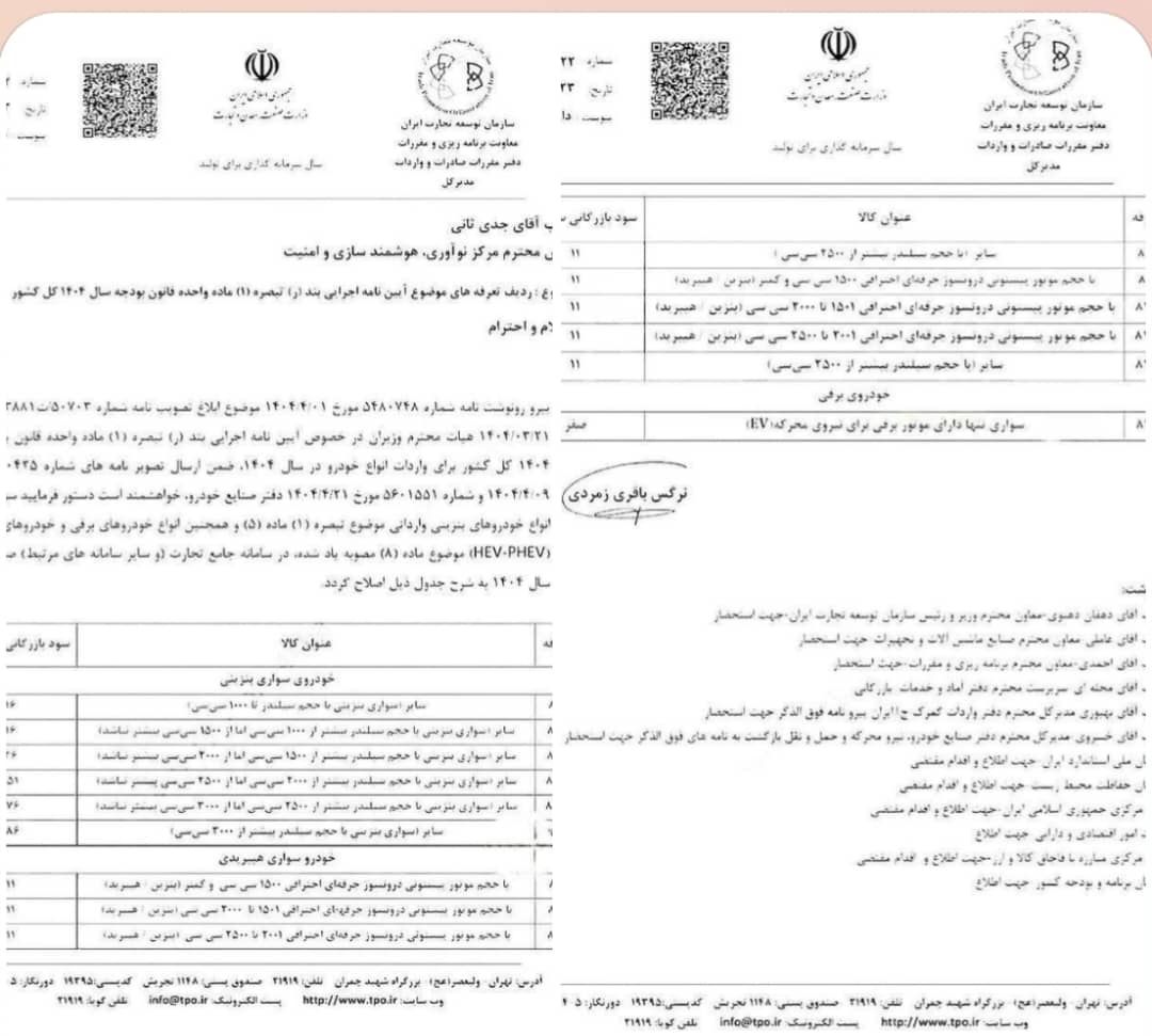 طبق تصویب‌نامهٔ هیئت وزیران سود بازرگانی خودروهای وارداتی (بنزینی، برقی و هیبریدی) در سامانهٔ جامع تجارت تا پایان ۱۴۰۴ کاهش می‌یابد.